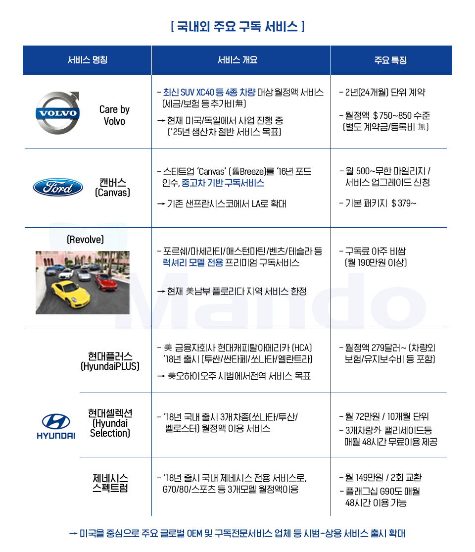 특히, 글로벌 자동차 제조사들은 MaaS의 등장을 새로운 시장 진입의 기회로 보고 Mobility Service 신사업 추진에 박차를 가하고 있습니다. 이런 맥락에서 구독 서비스는 수익 목적 외에도 향후 판매 증진을 위한 경험 마케팅의 일환으로도 활용 가능해 도입 확대가 예상됩니다. 또한, 소비자들에게도 차량 공유 서비스처럼 필요할 때 원하는 모델로 쉽게 확보할 수 있고 차량 관리에 신경 쓸 필요 없어 큰 매력으로 다가오고 있습니다.