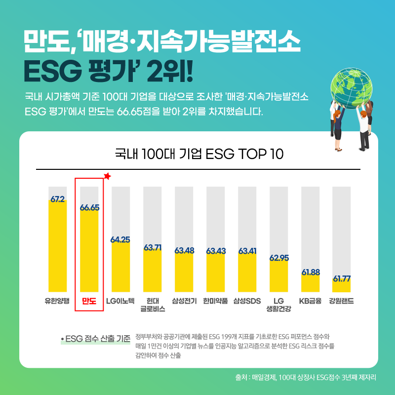 이에 만도는 괄목한 만한 성과를 냈습니다. 지난 1일, 내 시가총액 기준 100대 기업을 대상으로 조사한 `매경·지속가능발전소 ESG 평가`에서 만도는 66.65점을 받아 2위를 차지한 것이죠. 이는 전체 기업의 평균 54.24점을 훌쩍 뛰어넘는 기록입니다.