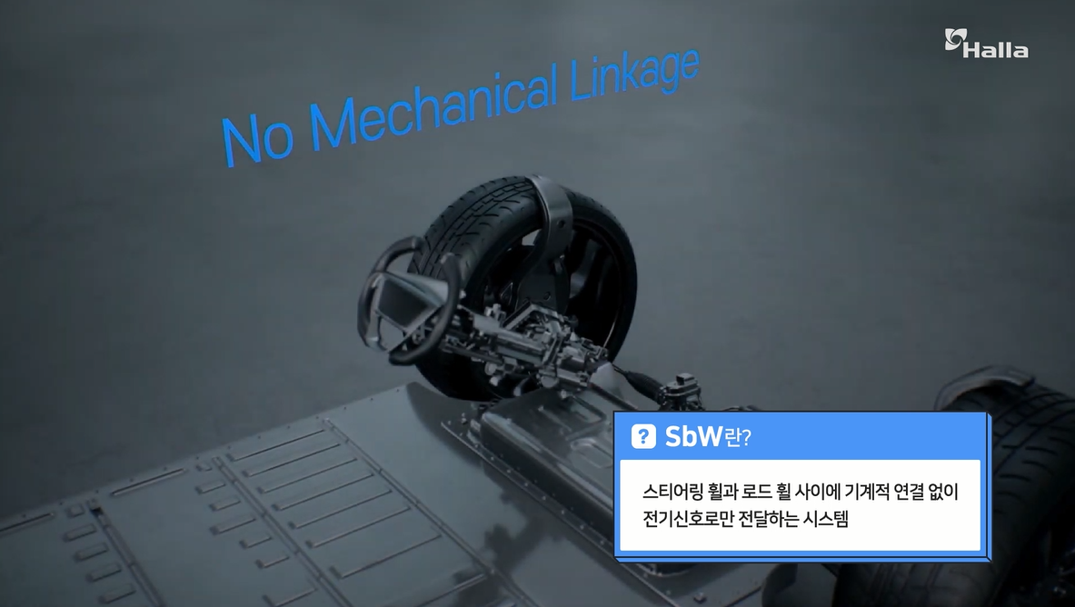SbW(Steer by Wire)는 운전자의 조향 의지를 스티어링 휠과 로드 휠 사이에 기계적 연결 없이 오직 전기신호로만 전달하는 자유 장착형 첨단 운전 시스템입니다.