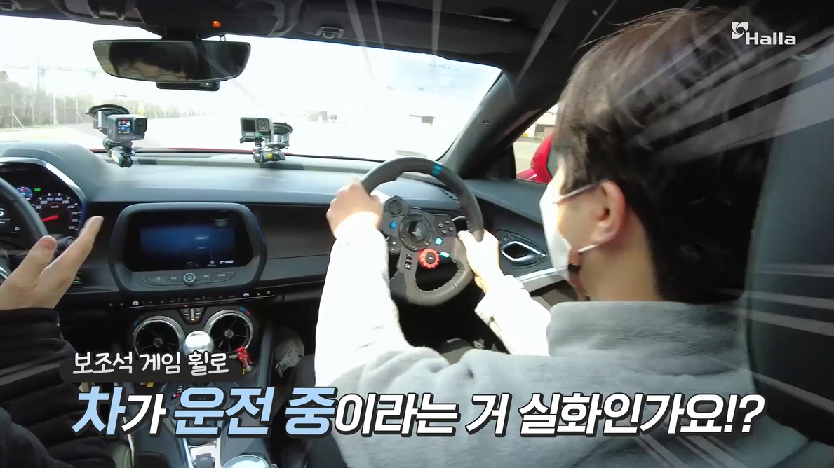 운전석에 앉은 김만호 책임연구원이 주행 중 핸들을 놓았지만 정상적으로 차가 주행하는 모습은 실로 놀라웠는데요. 정상 주행이 가능했던 이유는 바로 보조석에 앉은 이재우 연구원이 게임 휠로 차를 운전하고 있었기 때문이었답니다. 재미있게만 느껴졌던 게임 휠, SbW 구현을 위해서는 필수였네요!