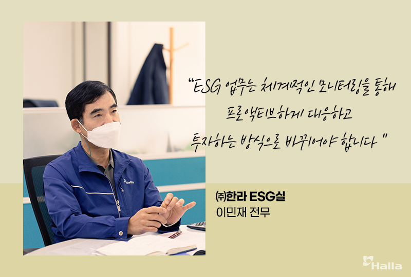 (이민재 전무) 우리는 한라그룹의 일원으로서 이미 오래전부터 정도경영과 사회적 책임을 중요한 과제로 생각하고 실천해 왔어요. 그동안 환경안전, 품질, 인사 등 ESG 유관부서들이 각자의 역할을 충실하게 수행해 주었고요. ESG실의 중심적 역할은 각 부서들의 노력이 전사 차원에서 시너지가 발휘되도록 방향을 제시하는 일입니다. 그리고 과거 ESG 관련 업무가 사후 처리 성격이 강했다면 앞으로는 체계적인 모니터링을 통해 프로액티브하게 대응하고 투자하는 방식으로 바뀌어야 합니다. 이러한 변화를 관리하거나 때로는 주도하는 일도 ESG실의 몫이죠.