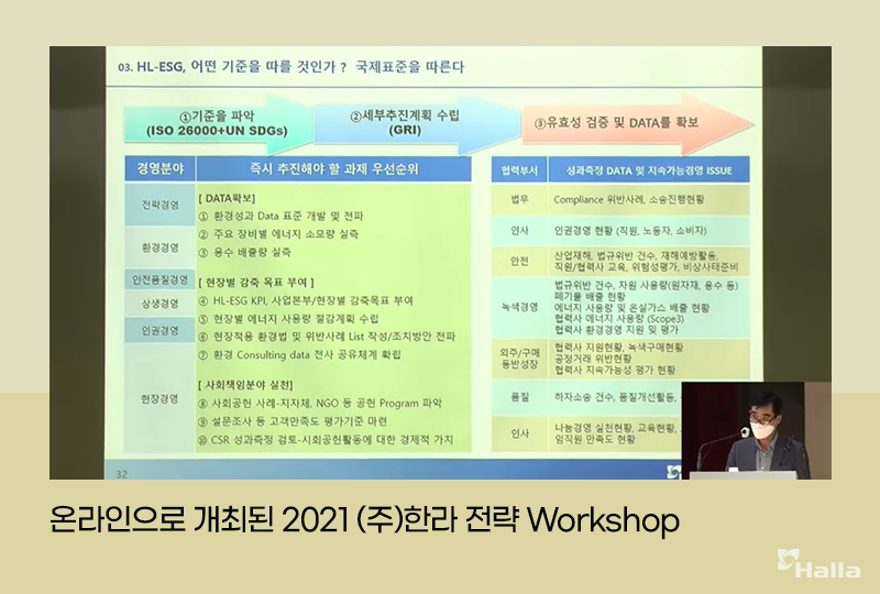 8월 9일, ㈜한라는 경기도 용인 한라인재개발원에서 ‘Be Brave & Awake!’를 테마로 ‘2021 전략 Workshop’를 개최했습니다. 이날 워크숍은 코로나 19 확산 상황을 고려해 온라인 실시간 중계 방식으로 열렸는데요. 각 사업부문은 작년 성장스토리 워크샵 이후 이행상황을 점검하고 보다 구체화된 미래전략을 발표했습니다.