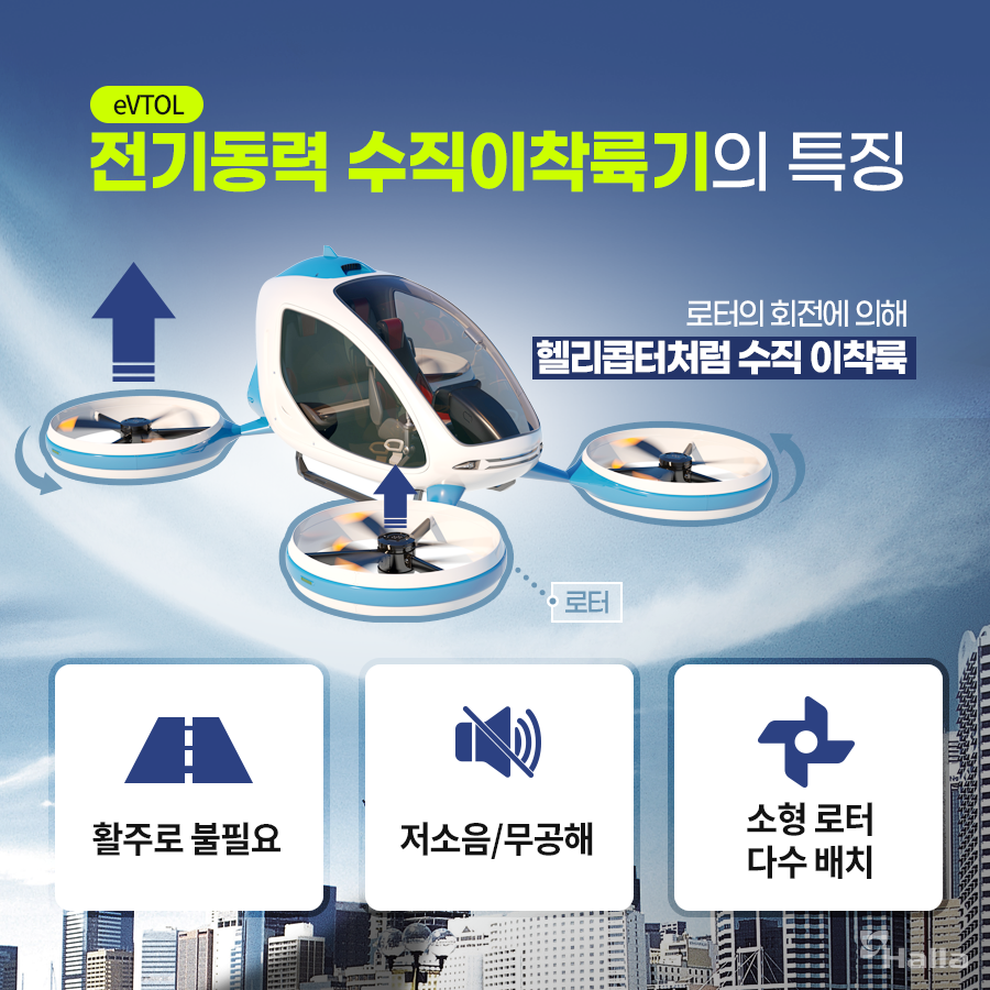 UAM 시대를 대표할 이동 수단은 ‘전기동력 수직이착륙기(eVTOL)’입니다. eVTOL는 헬기처럼 로터의 회전을 통해 수직 이착륙과 정지 비행이 가능합니다. 따라서 활주로 없이 자유롭게 이동할 수 있죠.