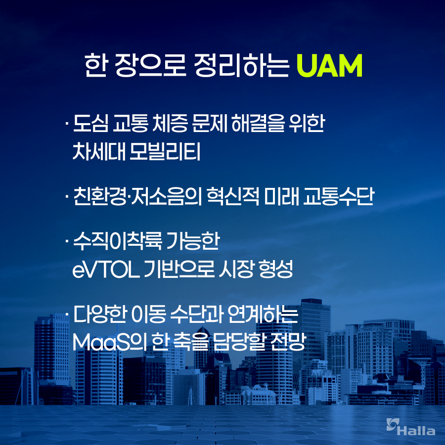 UAM은 수직 이착륙 비행기를 이동 수단으로 하는 새로운 교통 서비스를 의미합니다. 꽉 막힌 도로 대신 하늘길로 이동하는 것이죠. ‘시간은 금’이라고 말하는 현대인에게 UAM은 매력적인 수단입니다. UAM을 이용할 경우, 서울에서 인천까지 거리를 20분이면 오갈 수 있습니다.