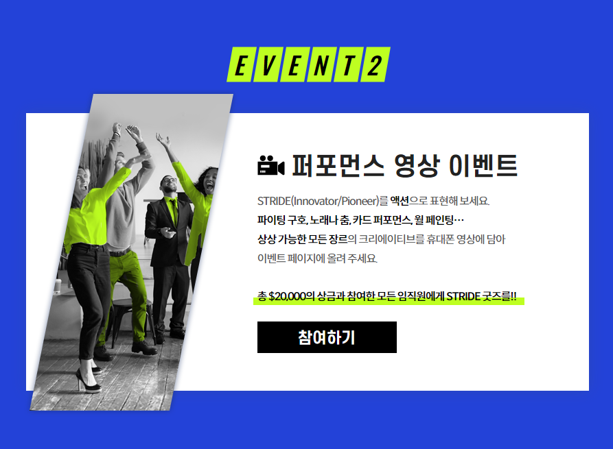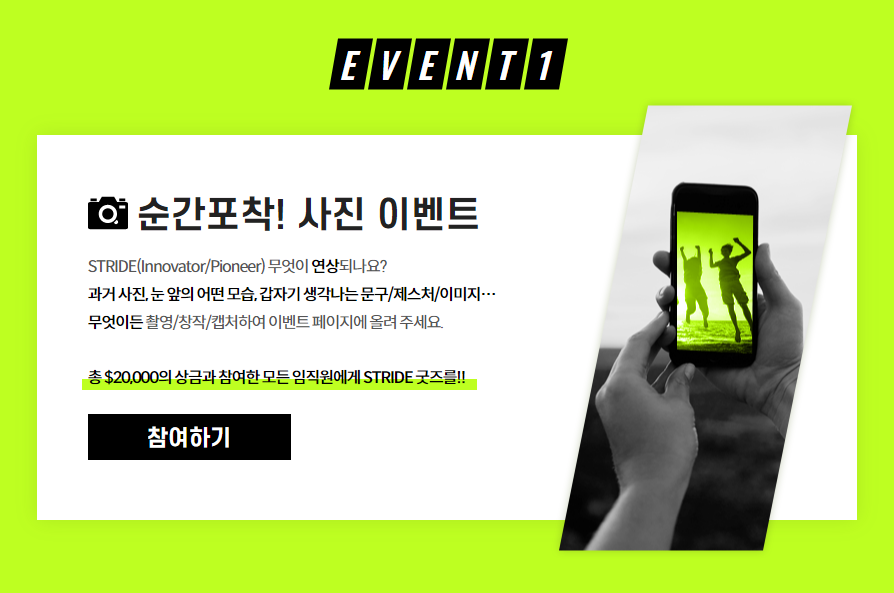STRIDE 이벤트 참여 방법은 사진과 영상 두 가지입니다. STRIDE에서 연상되는 장면 또는 영상을 이벤트 페이지에 업로드하세요. 참여한 임직원에게는 총 $40,000의 상금과 STRIDE 굿즈를 선물합니다.