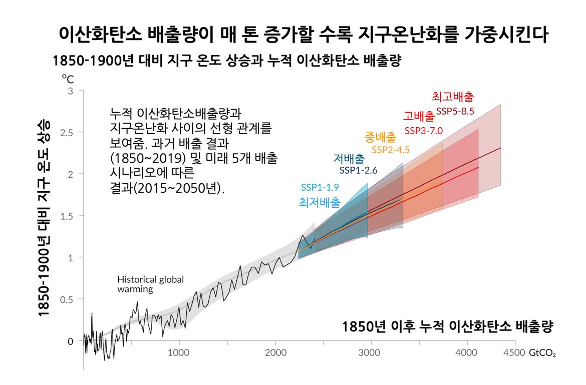 그동안 과학적 연구를 통해서 누적 이산화탄소 배출량과 지구온난화 사이에 선형관계가 있다는 것이 밝혀졌습니다. IPCC 제1실무그룹 6차 보고서는 1850년부터 2019년까지 누적 이산화탄소 배출량이 1850-1900년 대비 지구 온도 상승의 관계를 잘 보여주고 있습니다. 미래 지구온난화도 미래 누적 이산화탄소 배출량과 선형적으로 비례합니다.
