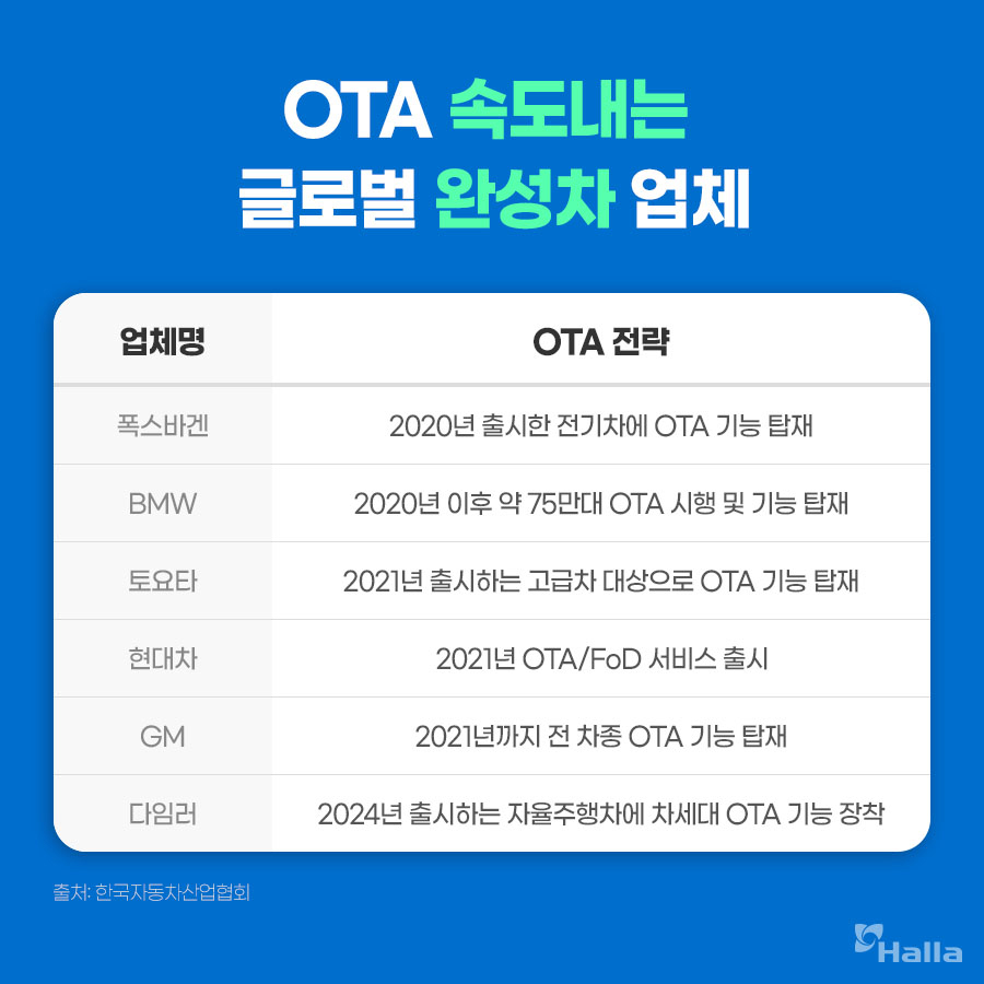 새로운 성장 모멘텀을 확보하기 위해 주요 완성차 업체가 OTA 출시에 힘쓰고 있습니다.