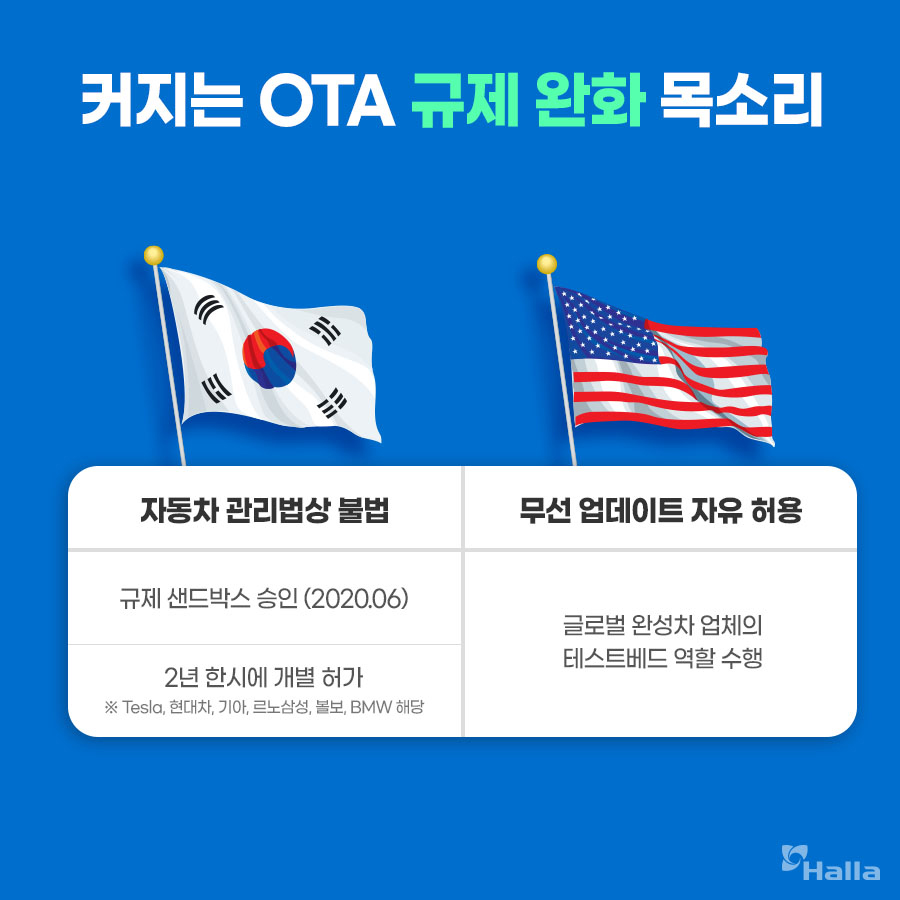 가까운 미래, OTA는 보편적인 기능으로 자리 잡을 예정인데요. 우리나라에선 자동차 관리법상, OTA를 정비 업무로 보고 있습니다. 따라서 반드시 정비소에 방문해야만 업데이트를 받을 수 있습니다. 이는 무선으로 차량 기능을 조종함에 따라 발생할 수 있는 안전상의 문제를 신중히 접근하기 위함인데요. 업계 목소리를 의식해 지난해 규제 샌드박스를 마련하고 특례 신청한 업체에 한해 2년간 한시적 허가를 내주었습니다.