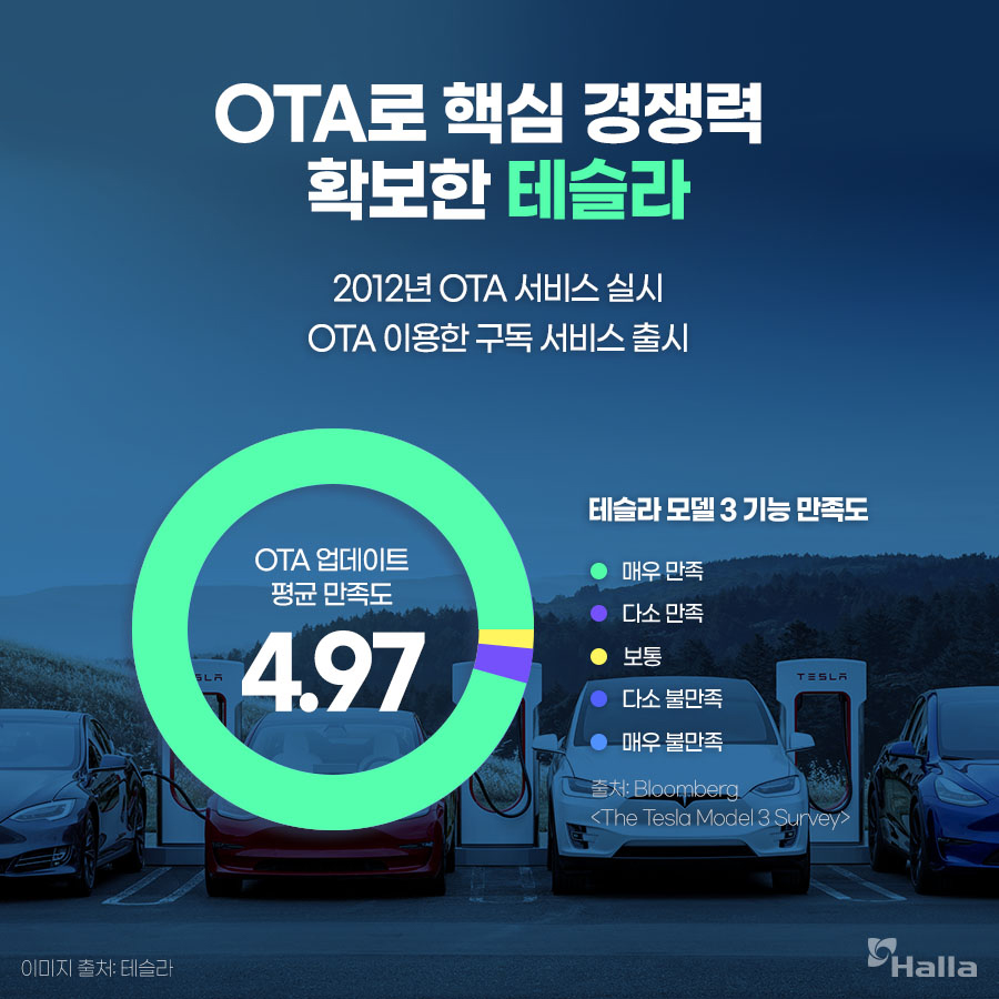 이러한 관행을 깨고 지난 2012년 테슬라는 업계 최초 OTA 서비스를 선보였습니다. 신형과 구형 구분 없이 소프트웨어 업데이트만으로 동일하게 차량 기능을 향상할 수 있도록 했죠. 그 결과 연식이 있는 모델이라도 새 차와 동일한 성능을 유지할 수 있게 됐는데요. 출시된 지 8년, 6년이 지난 모델 X와 모델 S가 여전히 신차 대비 85% 수준의 가격을 유지하는 이유가 됐습니다. 이는 곧 차주들의 만족도를 높이는 결과를 낳았는데요. 대다수 차주가 OTA 서비스에 높은 만족을 표시했습니다.