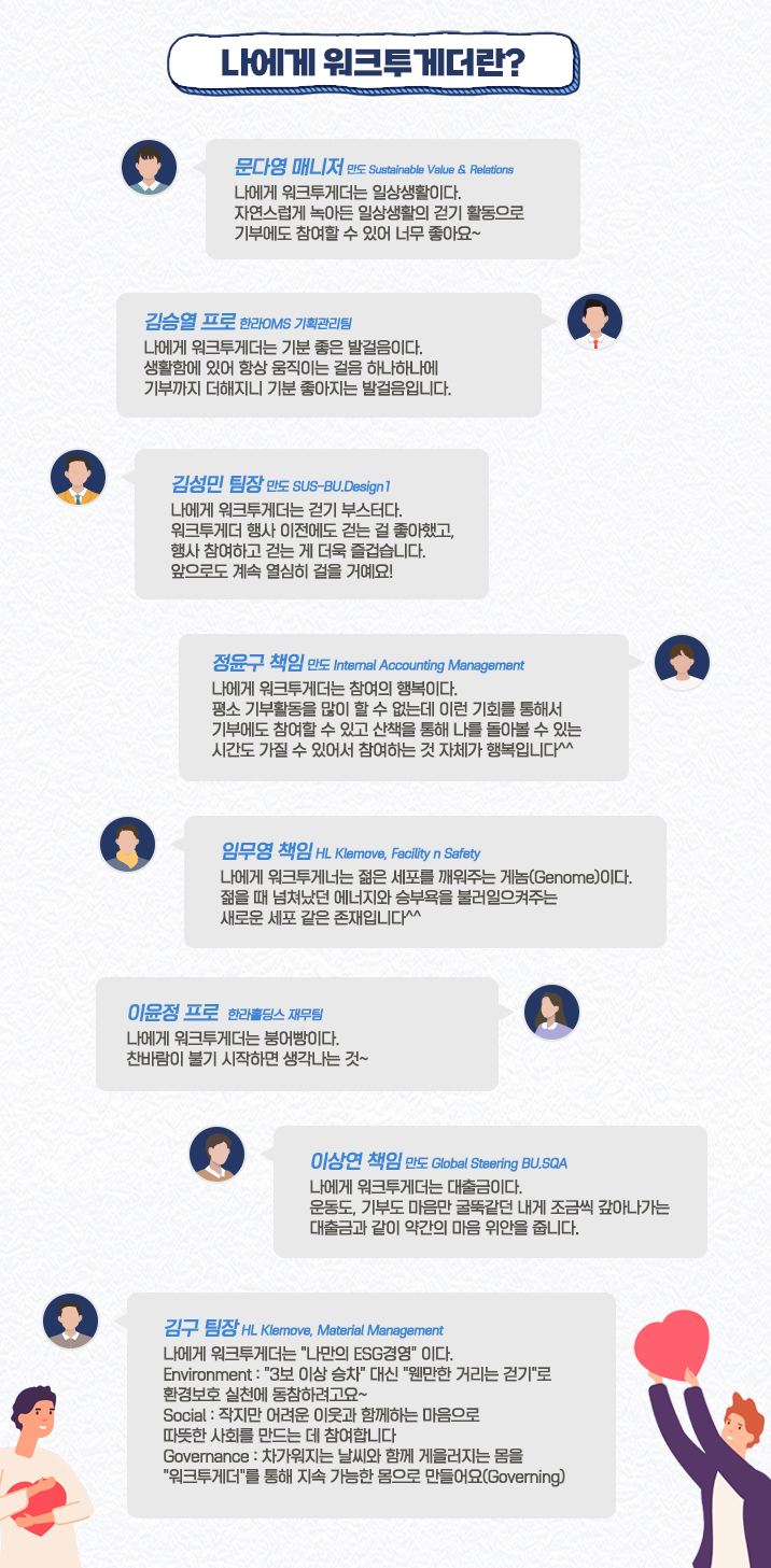 많은 임직원에게 워크투게더는 일상 속 기부활동이자 승부욕을 불태우는 삶의 활력소라는 사실을 알 수 있었네요. 그 덕분일까요? 최근 진행된 한라그룹 STRIDE 캠페인에서도 많은 임직원이 ‘미래를 향한 대담한 발걸음’으로 워크투게더 활동을 소개했답니다.