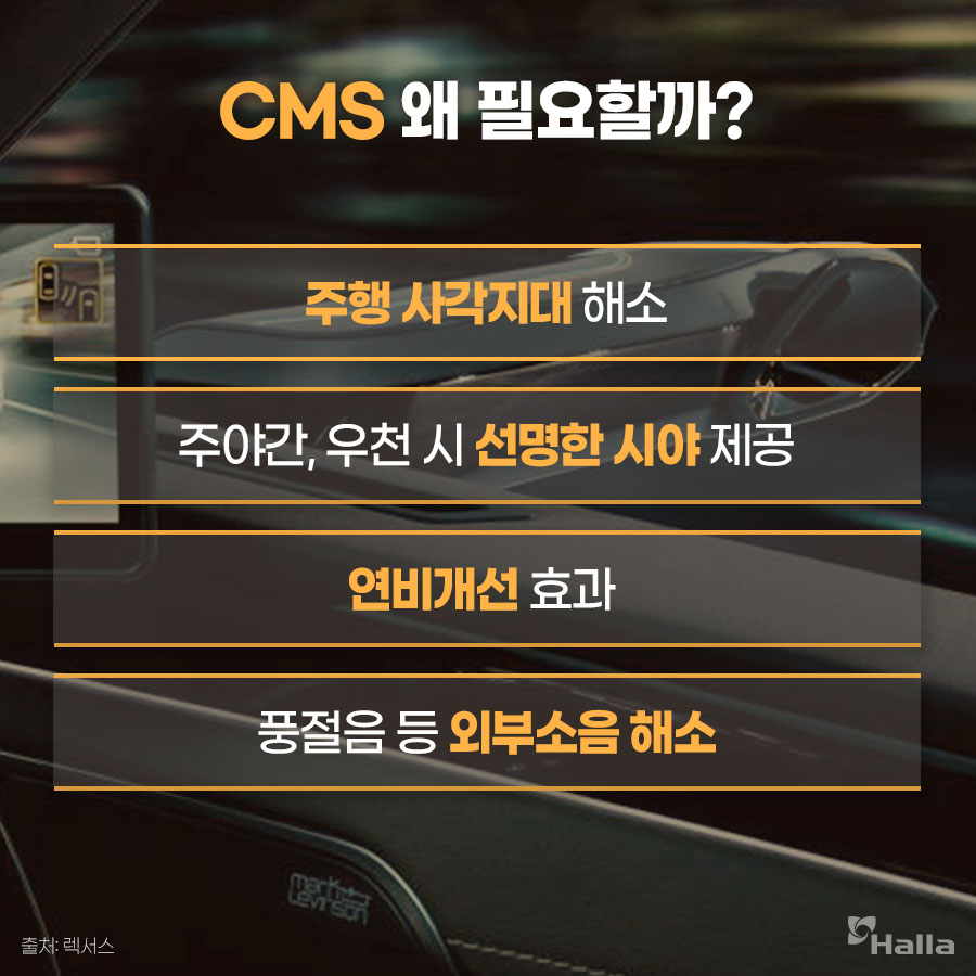 CMS의 등장은 전기차 전환 추세와 관련이 있습니다. 배터리를 사용하는 전기차는 내연기관차보다 통상 300kg 정도 더 무겁습니다. 자동차는 무거울수록 에너지 효율이 떨어지는데요. 현재로선 기술적인 문제로 무게를 줄이기 어렵습니다.