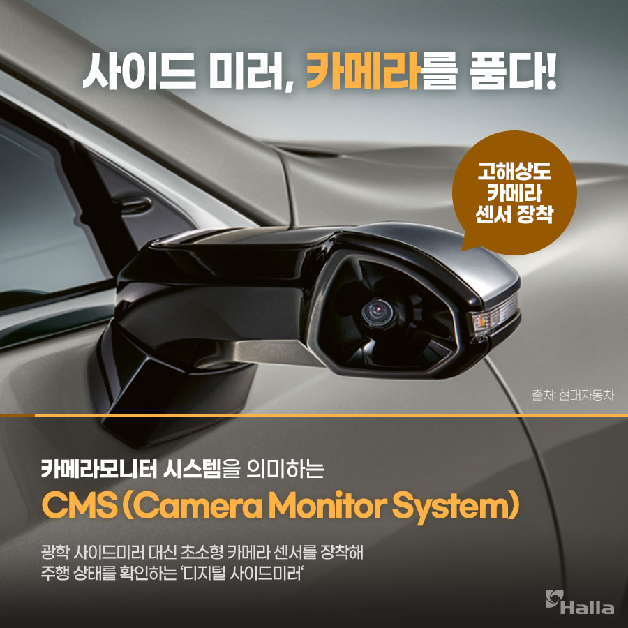 CMS(Camera Monitor System)는 반사경 대신 카메라와 모니터를 결합하여 시야를 확보하는 장치를 말합니다. 흔히 ‘디지털 사이드미러’라고도 불리는데요. 2017년, 국내 자동차 규칙이 일부 개정되며 장착이 허용됐습니다.