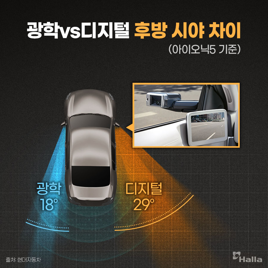디지털 사이드미러는 카메라 센서를 사용하므로 거울보다 더 넓게 촬영할 수 있습니다. 따라서 기존보다 넓은 29도의 시야각을 제공 해후 방 시야를 확보하고 안전사고 위험을 줄일 수 있습니다.