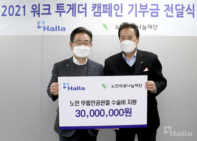 한라그룹이 제주도 노인 인공관절수술을 위해 개최한 ‘2021 Walk Together(워크투게더)’를 성공적으로 마무리했습니다. 그룹 임직원(1,034명)이 마련한 기부금 3,000만원은 지난 7일 ㈜제이제이한라 제주도 법인을 통해 노인의료나눔재단에 전달됐습니다. 기부금 전달식에는 ㈜제이제이한라 남규환 대표, 노인의료나눔재단 김성환 이사장 등이 참석했습니다.