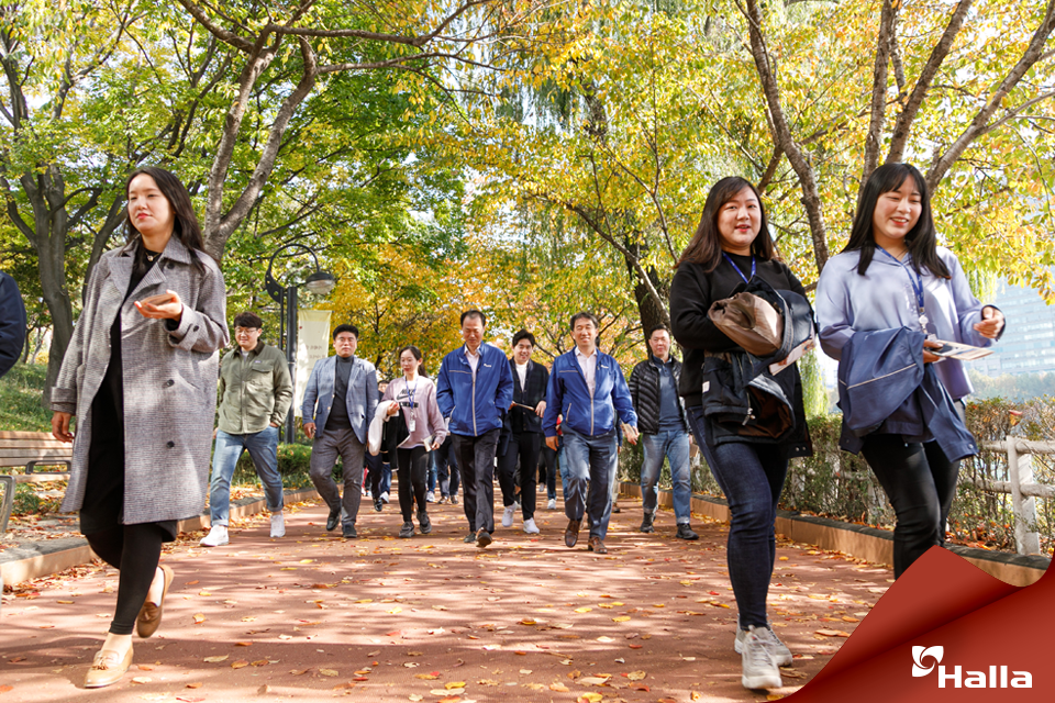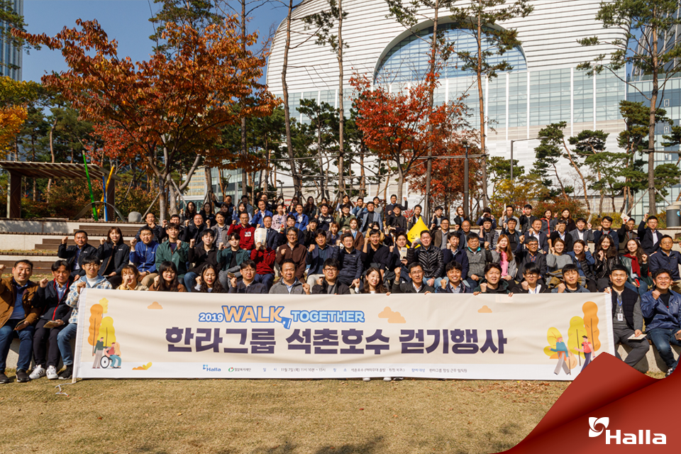 ‘2019 Walk Together 걷기행사’를 위해 한라그룹 임직원 100여 명이 한자리에 모인 것인데요. 이번 걷기 행사는 ‘2019 Walk Together’’에 대한 직원들의 관심과 참여를 이끌어내기 위해 마련된 자리로, 사랑의 온도계 퍼포먼스, 경품추첨 등 다채로운 이벤트가 더해져 직원들에게 색다른 즐거움을 선사했습니다.