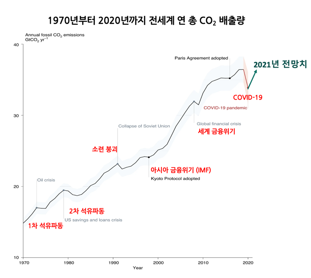 지난해 상당한 경제 악화를 경험한 모두 국가들이 경제 회복을 위해 봉쇄를 풀며 2021년 이산화탄소 배출은 크게 증가하고 있습니다. 국제에너지기구 전망에 따르면 2021년 이산화탄소 총 배출량은 2019년 이산화탄소 배출량과 맞먹을 전망입니다.