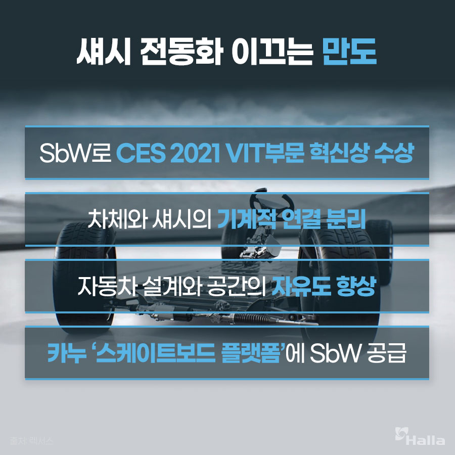 한국에서는 모빌리티 전문 기업 만도가 섀시의 전동화 트렌드를 이끌고 있습니다. CES 2021에서는 만도의 SbW가 VIT 부문 혁신상을 수상하기도 했죠.