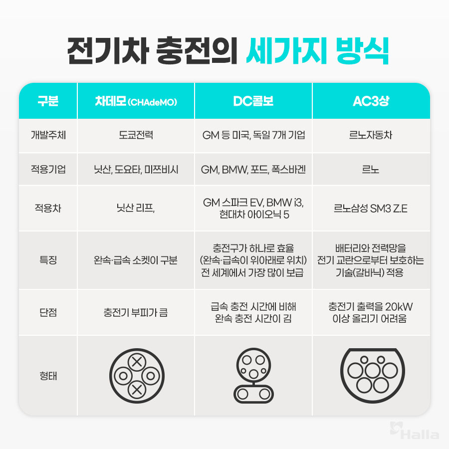 안드로이드와 애플 스마트폰이 서로 다른 충전 케이블을 사용하는 것처럼 전기차 역시 제조사와 국가별로 다른 충전 규격을 사용하고 있습니다. 국제표준화기구(ISO)는 DC콤보와 차데모, AC3상 세 가지를 전기차 급속 충전 표준 규격으로 인정하고 있죠.
