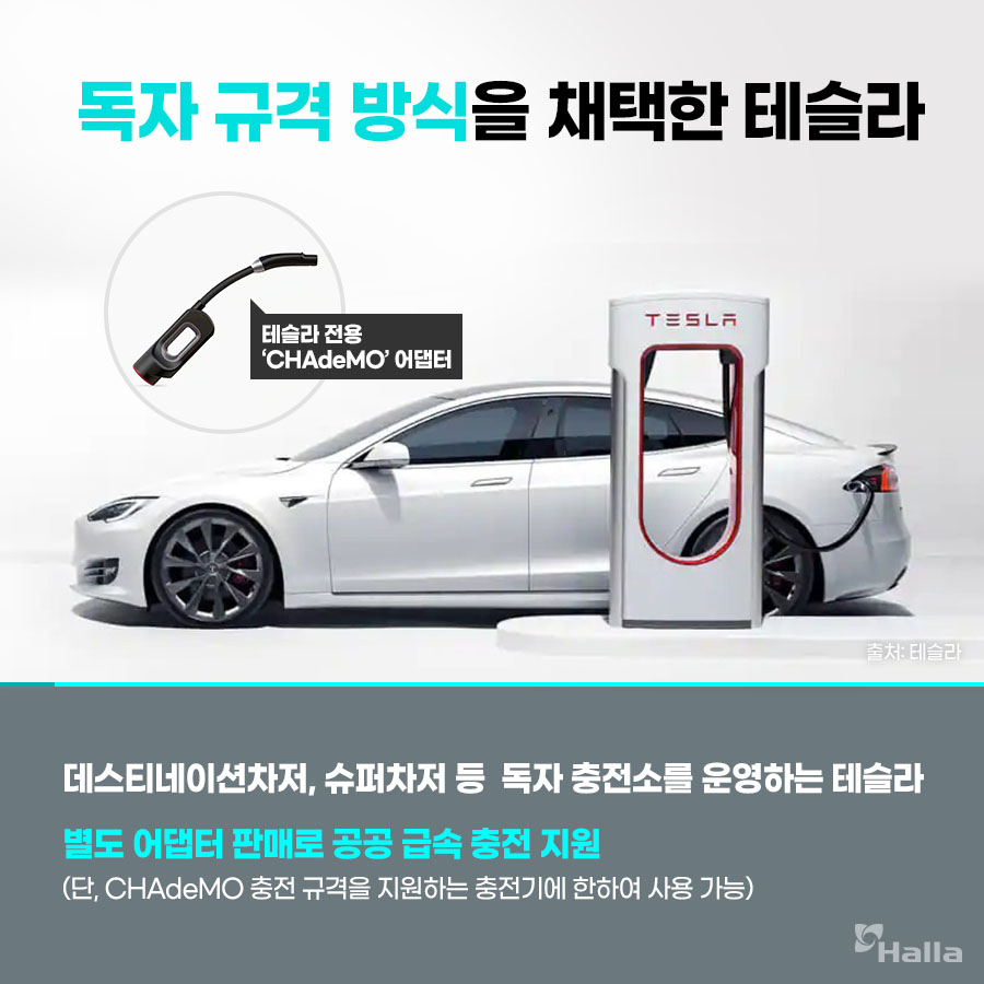 이와 별개로 테슬라는 국제 표준에 없는 독자적인 충전 방식을 사용합니다. 또 충전을 위해선 ‘데스티네이션차저(완속)’, ‘슈퍼차저(급속)’ 라고 부르는 전용 충전소를 찾아가야만 하죠. 따라서 테슬라 오너는 정부나 민간이 설치한 전기차 충전소가 늘어난다고 해도 별다른 편의를 누릴 수 없었습니다. 이에 테슬라는 차데모 어댑터를 출시하고 인프라 부족 해결에 나섰죠.
