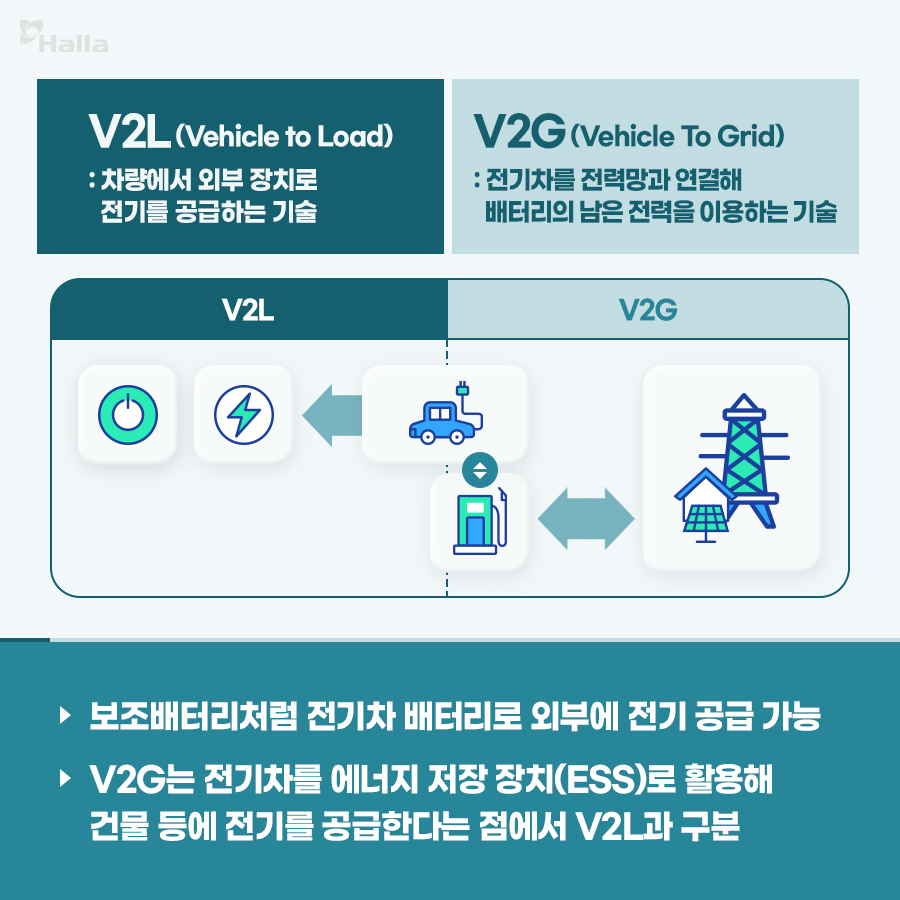 여기에 큰 영향을 미친 기술이 바로 V2L인데요. V2L은 자동차를 보조배터리처럼 사용해 외부 장치에 전기를 공급하는 기술입니다. V2L은 전기차를 전력망과 연결해 배터리의 남은 전력을 이용하는 V2G에서 파생된 개념이기도 합니다.