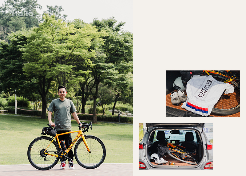 그렇다면, 김재현 책임매니저의 자동차에는 무엇이 들어있을까요? 트렁크를 열자 주황색 로드 자전거 1대와 각종 사이클용품이 눈에 띕니다. 로드 자전거 1대로 서울~부산~서울 간 1,000km 코스를 완주한 김재현 책임매니저. 그의 취미는 장거리 사이클링입니다.