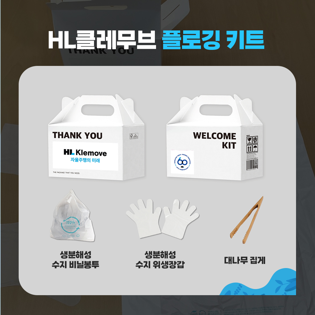 친환경 박스에 생분해성 수지 비닐봉투와 위생장갑, 대나무 집게로 구성된 키트군요. 군더더기 없는 구성에 구성품들 모두 친환경 소재로 제작되었습니다. ‘HL Klemove, 자율주행의 미래’가 적힌 박스를 들고 플로깅을 하다 보면 자부심도 뿜뿜이겠는데요.