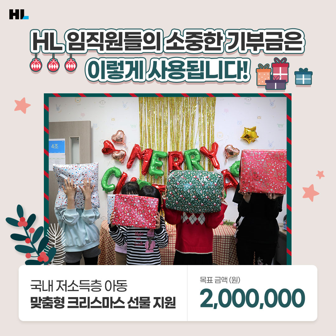 크리스마스를 설레는 마음으로 기다리고 있을 아이들에게 따뜻함을 선물해주세요! HL 임직원의 소중한 기부금은 ‘사단법인 위스타트’를 통해 국내 저소득가정 아동의 크리스마스 선물 지원비로 전달될 예정인데요. HL은 세상의 모든 아이들이 행복한 크리스마스를 보내기를 소망합니다.