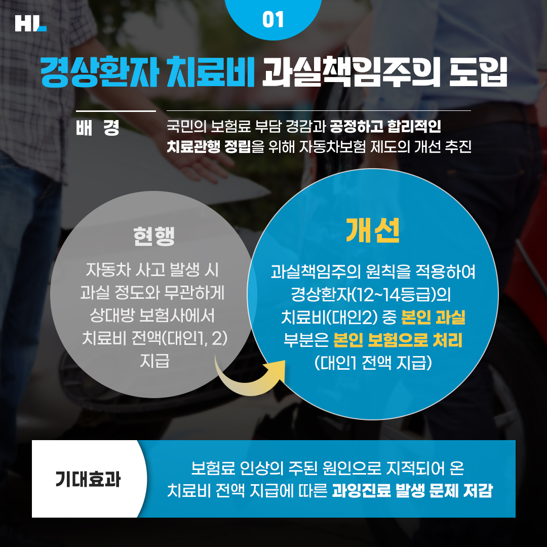 자동차 사고 발생 시 현행되는 자동차보험 제도는 사고 과실 정도와는 무관하게 양측 보험사가 상대방의 치료비 전액(대인1*, 대인2**)을 지급합니다. 이는 손해배상 법리에도 부합하지 않을뿐더러, 끊이지 않는 과실 비율 분쟁을 초래했습니다. 더불어 제도의 허점을 악용하는 경상환자*** 과잉진료는 자동차보험료 인상의 주된 원인으로 지적되며 제도 개선 필요성이 제기되었습니다.