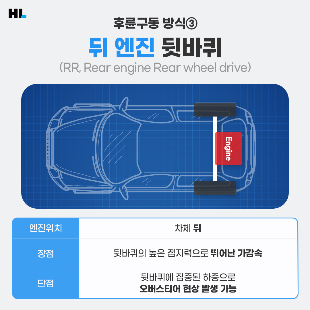 뒤 엔진 뒷바퀴(RR)는 엔진이 차체 뒤쪽에 위치해 다른 후륜구동 방식에 비해 탑승 공간 확보에 용이합니다. 또한, 뒷바퀴에 집중된 하중으로 바퀴 접지력이 높아 뛰어난 가감속과 스포츠 드라이빙이 가능하죠. 하지만 그로 인해 코너링 시 원하는 것보다 더 많이 회전하게 되는 오버스티어 현상이 발생할 수 있기 때문에 운전에 유의해야 합니다.