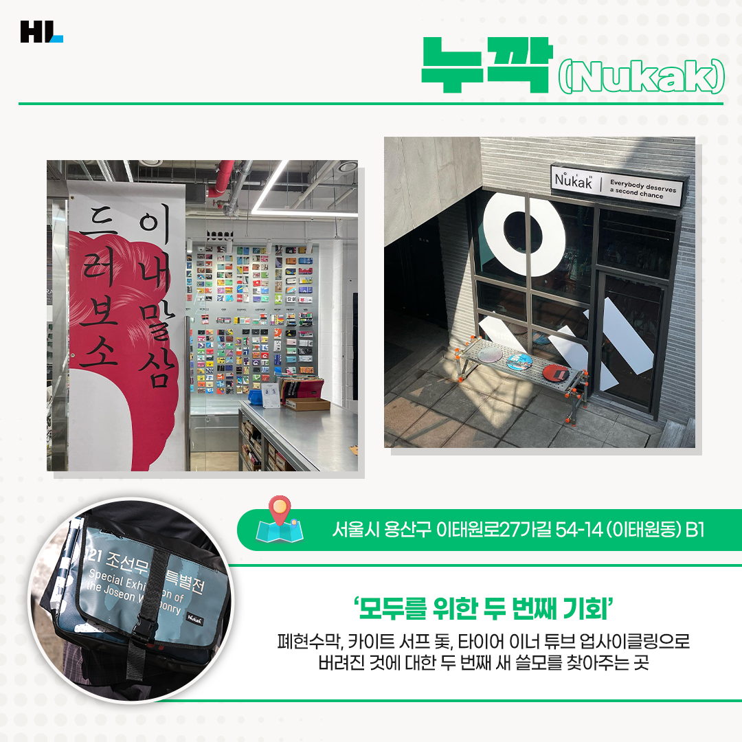 이태원동에 위치한 누깍(Nukak)은 버려진 폐현수막, 카이트 서프 돛, 타이어 이너 튜브를 활용한 세상에 단 하나뿐인 힙한 아이템들을 만날 수 있는 곳입니다.