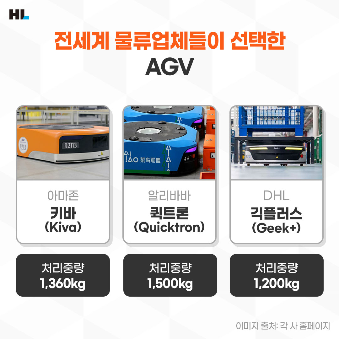 AGV가 로봇처럼 무인주행을 하는 탓에 최근 새롭게 등장한 스마트 솔루션이라 생각할 수 있으나 물류 혁신의 대표주자 아마존은 이미 약 10여 년 전부터 AGV를 도입해 운영하고 있습니다. 로봇청소기 같은 귀여운 모습과는 달리 AGV ‘키바(Kiva)’는 시속 4.8km로 움직이며 1,360kg의 고중량 물품을 처리합니다. 본체 위·아래에 설치된 카메라는 위치를 파악하고, 정면에 부착된 적외선 센서는 장애물과의 충돌을 방지합니다. 300명의 근로자가 하던 일을 키바 25대만으로 수행 가능하다고 하는데요. 이렇게 AGV의 뛰어난 성능이 입증되자 DHL·알리바바 등 경쟁업체들도 뒤이어 AGV를 도입 및 활용하고 있습니다.