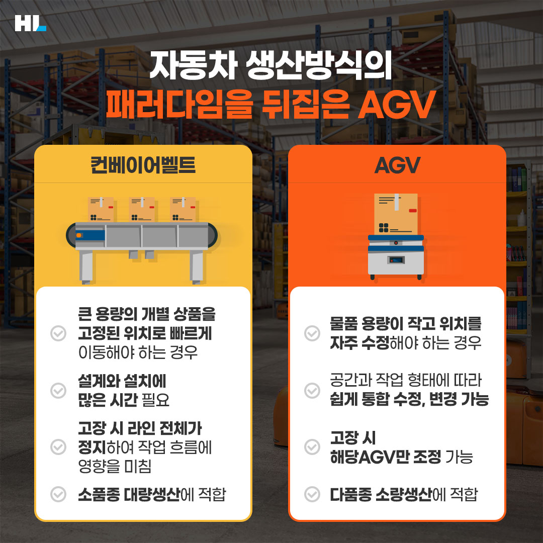 물류뿐 아니라 생산라인에서도 AGV의 활약이 돋보입니다. 과거에는 자동차를 생산할 때 효율성을 높이기 위해 컨베이어벨트 라인을 도입하여 활용했습니다. 자동차의 뼈대가 벨트를 따라 이동하면 작업자들이 각자가 담당하는 부품을 장착하는 형태였죠. 생산 속도가 매우 빨랐기 때문에 규모의 경제를 실현시키며 자동차의 대중화를 이끄는 공을 세웠습니다. 하지만 오늘날 기술의 발달로 무인로봇 시스템이 등장하고, 소비자 욕구 다양화로 다품종소량생산 방식이 요구되면서 컨베이어벨트는 AGV에 그 자리를 내주게 되었습니다.