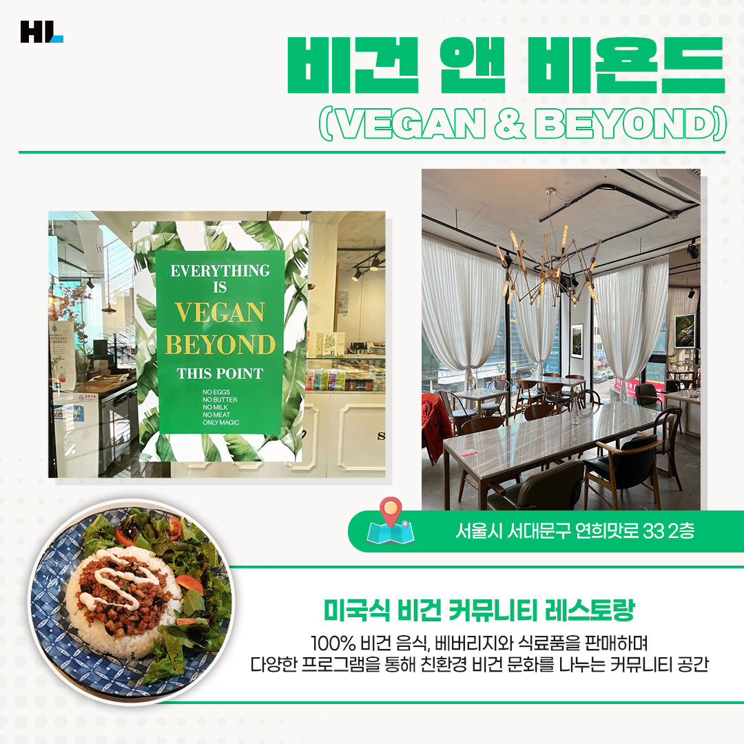 연희동에 위치한 비건 앤 비욘드는 그로서리 스토어와 커뮤니티 공간의 기능을 갖고 있는 미국식 비건 레스토랑입니다. 이곳에서 판매하는 음료와 주류, 식료품 등 모든 음식물은 100% 비건을 지향합니다. 국내산 유기농, 무농약 인증 농산물을 사용하며 우유 대신 두유를 선택할 수 있고, 글루텐 프리 옵션도 있어 취향에 따라 선택할 수 있죠.