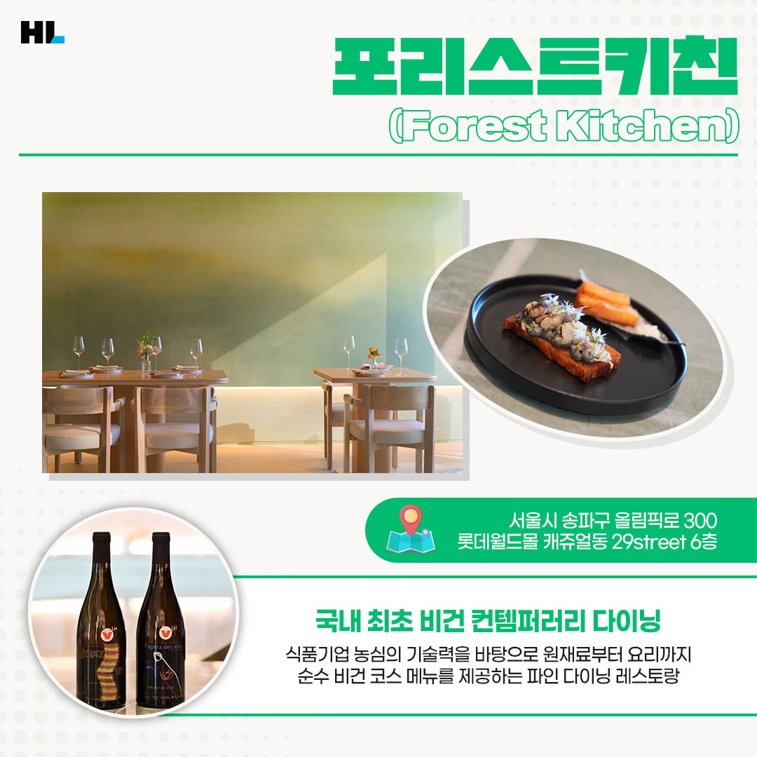 한편, 포리스트키친은 지난해 서울시가 발표한 ‘2022 테이스트오브서울(Taste of Seoul) 100선’에 이름을 올리며 맛과 품질을 인정받았습니다. 선정된 100개의 레스토랑 가운데 지난해 새롭게 오픈한 채식 레스토랑은 포리스트키친이 유일하죠. 또, 탄소 배출량 감소를 위해 가스 화구 대신 인덕션을 설치했으며, 천연자재를 활용한 인테리어, 린넨 냅킨 레스토랑 인테리어와 운영 과정에도 친환경을 고려했습니다.
