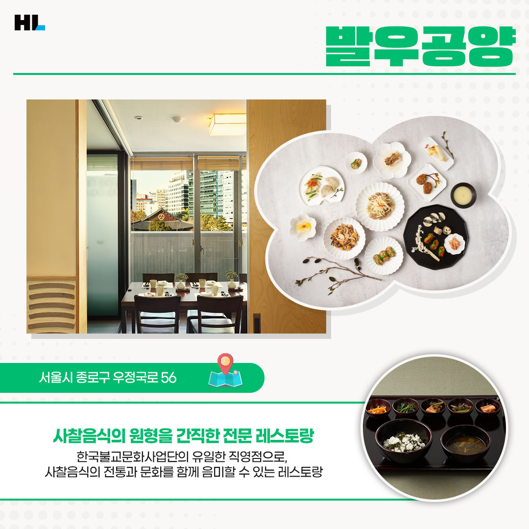 사찰음식은 유제품을 제외한 모든 동물성 식품과 오신채* 사용을 피하고 자연친화적인 식재료와 조리법을 통해 몸과 마음을 건강하게 다스릴 수 있게 하는 수행음식으로 알려져 있습니다. 종로의 사찰음식 전문점 발우공양은 한국불교문화사업단에서 유일하게 직접 운영하고 있는 사찰음식 전문 레스토랑입니다. 한국불교의 1,700여 년 역사가 고스란히 깃든 전통적인 조리법으로 사찰음식의 원형을 전승하고 있다는데요.
