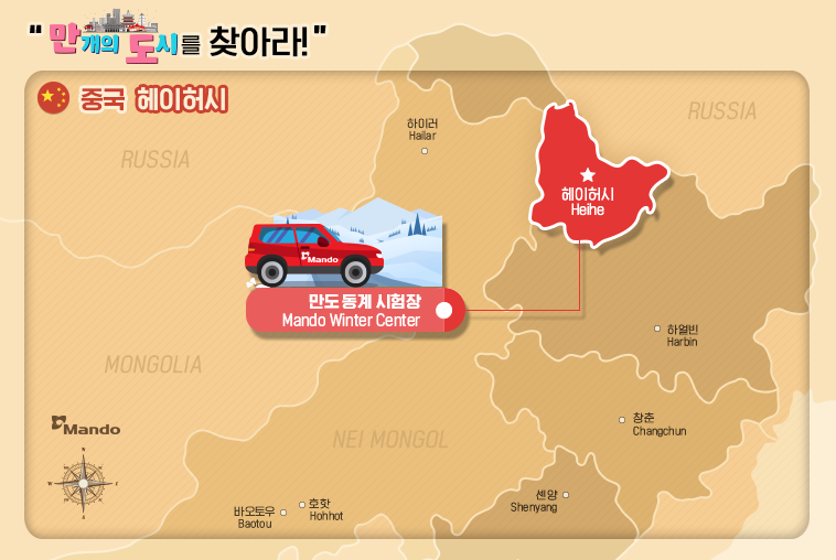 그리고 혹독한 추위가 닥치는 겨울일단 이 오면 하얼빈에서 비행기로 1시간 거리에 있는 헤이허(黑河. 이하 ‘흑하’)가 주목을 받습니다. 2003년 만도가 이곳에 세계 최초로 동계 자동차 주행 시험장을 만들었고 겨울이 되면 전 세계 70여 개의 자동차 부품, 완성차 업체들이 짐을 싸들고 모여들기 때문입니다. 일종의 ‘겨울장’이 선다고 할까요? 혹한의 날씨가 반가운 흑하에서는 지금 뜨거운 차량 동계 테스트가 진행되고 있습니다.