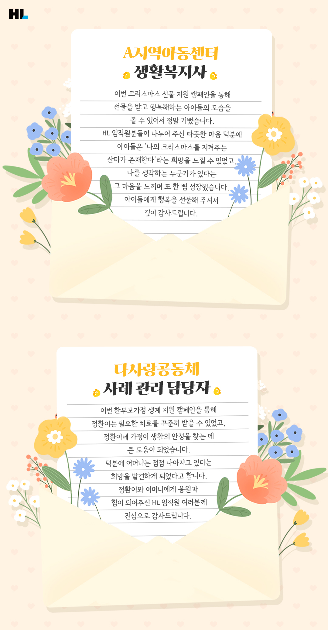 경제적 어려움으로 크리스마스와 같은 특별한 날을 기념하지 못하는 경우가 대부분인 저소득 가정의 아이들. 아이들이 상대적 박탈감과 소외감을 느끼지 않도록 지난 12월, HL은 ‘사단법인 위스타트’와 함께 맞춤형 크리스마스 선물을 지원하는 기부캠페인을 진행하였습니다.