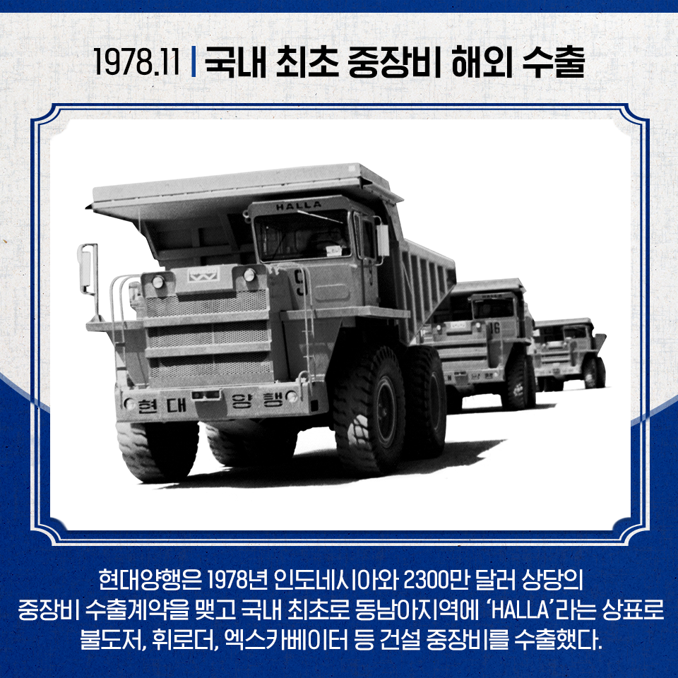이후 군포공장에서는 불도저, 엑스카베이터, 모터그레이더, 트럭크레인, 크롤라크레인 등 건설중장비를 비롯해 전기고가 이동 크레인, 포크리프트트럭, 포테이너 등 운반하역 기계, 크러싱 플랜트, 아스팔트 플랜트 등 광산•건설 기계를 생산하는 대규모 공장으로 자리 잡았습니다. 특히 1978년 국내 최초로 중장비를 해외로 수출하는 개가를 올렸습니다. 이때 상표를 ‘HALLA’로 정하며 ‘한라’의 이름이 처음 등장합니다.