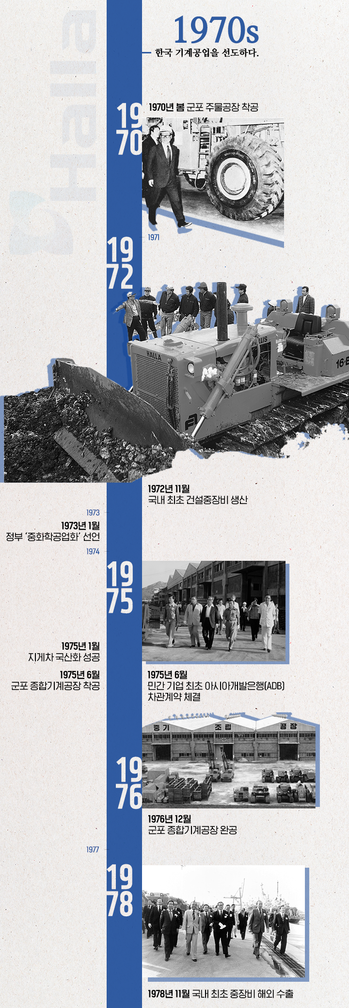 기계공장을 1972년 6월 완공하고 그 해 11월 국내 최초로 트럭크레인을 생산하면서 건설 중장비 국산화 시대를 활짝 열었습니다. 군포공장은 이후 1973년 1월 주조공장, 1974년 10월 중기계공장, 1976년 8월 경기계공장을 차례로 준공하며 한국 최고의 기계공장으로 자리매김했습니다.