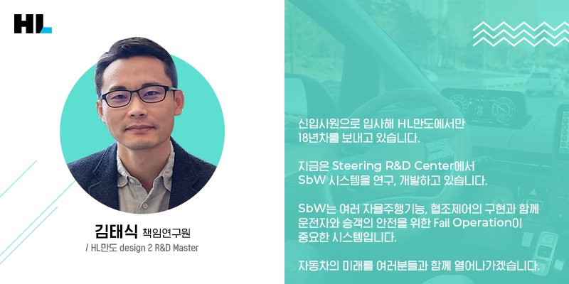 HL만도는 이처럼 다양한 아키텍처 개발 과정을 거쳐 SbW 개발에서 필수적으로 요구되는 ‘페일 오퍼레이셔널’이라는 과제에 다중화 시스템을 적용, 정상 작동이 이뤄지도록 구현했습니다. HL만도는 이제 확대된 다중 장애를 대비한 설계와 스티어-바이-브레이크 또는 후륜 조향 등의 통합제어를 통해 자율주행의 안전성을 높일 수 있도록 지속적인 연구와 개발을 진행하고 있습니다.
