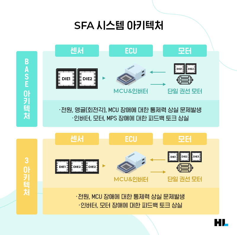 ‘3 Architecture’의 경우 앞서 언급된 베이스 아키텍처와는 다르게 센서 신호 다중화(Sensor Signal Redundancy)를 구현, 센서 각도(Sensor Angle)와 MPS의 단일 장애에 대해서는 정상 구동이 가능하지만 여전히 전원과 MCU, 인버터 등의 장애에 대해서는 통제력 상실과 피드백 토크의 문제가 발생할 수 있습니다.