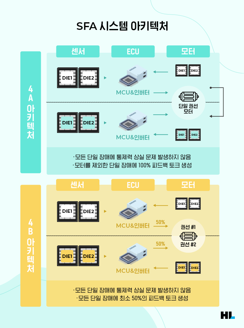 그렇다면 SFA 시스템의 단일 장애 발생 시 조향 제어와 피드백 토크를 유지/확보할 수 있는 구조는 어떤 것이 있을까요? ‘4A 아키텍처’라고 불리는 중복 백업 시스템은 모터를 제외한 모든 서킷(Circuit)이나 신호가 다중화돼 있어 어떤 단일 장애가 발생해도 통제력을 상실하지 않으며, 모터 외의 단일 장애에 대해 100%의 피드백 토크를 생성합니다.