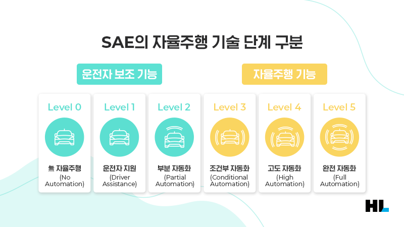 자율주행 기술은 크게 6단계로 구분됩니다. 이 구분은 미국자동차공학회(SAE International, 이하 SAE)에서 세분화해 정의했으며, 현재 국제적으로 통용되고 있습니다. 레벨이 높아질수록 운전에 있어서 인간의 개입은 최소화됩니다.