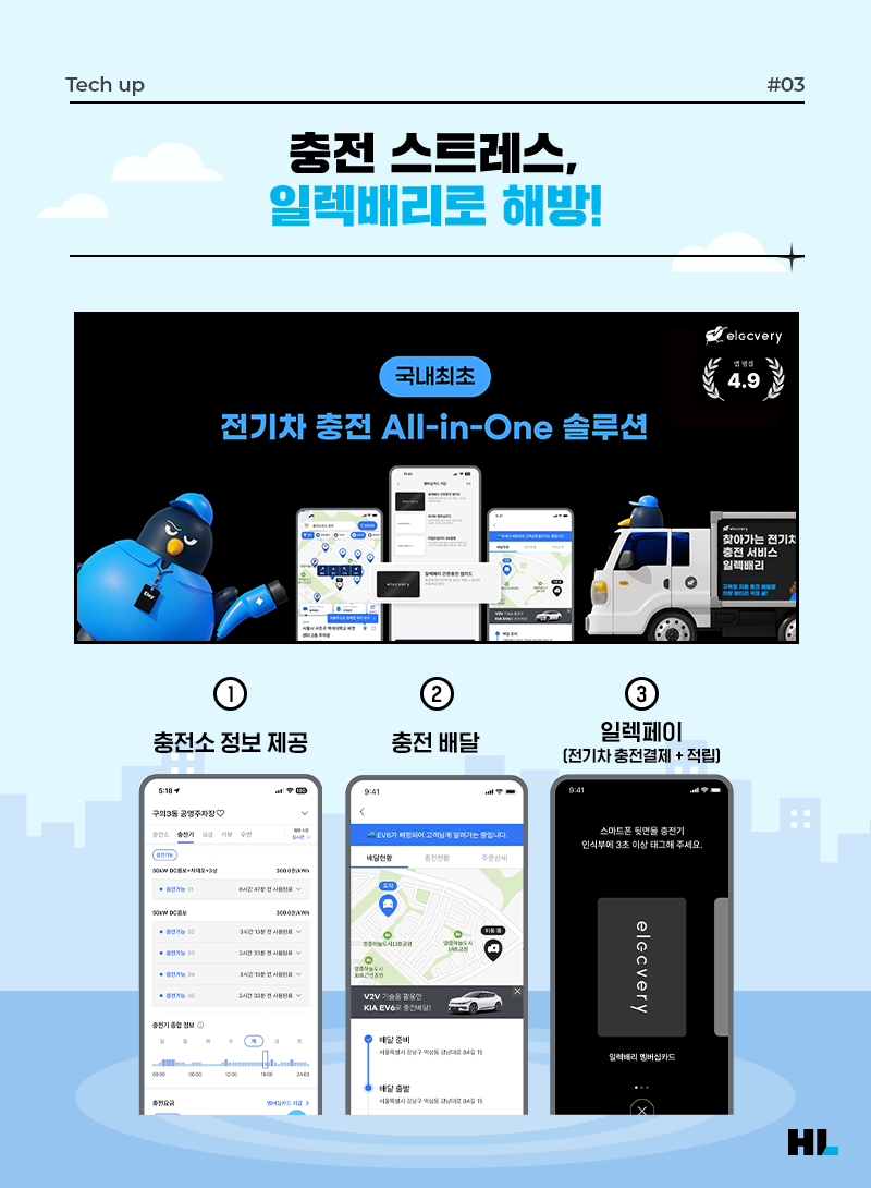 귀여운 키위새 로고가 돋보이는 티비유의 대표 서비스인 ‘일렉배리’는 무엇일까요? 일렉배리는 전기차 차주들이 충전 스트레스를 완벽히 해소할 수 있도록 다양한 전기차 충전 관련 서비스를 제공하는 모바일 앱 기반의 플랫폼 서비스인데요.