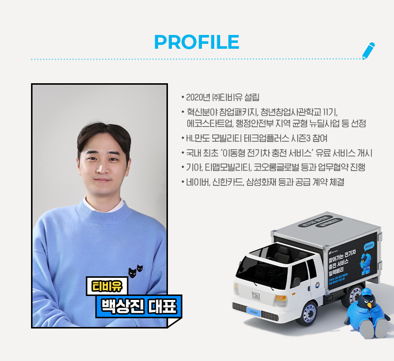 오늘은 전기차 차주들을 충전 고민으로부터 해방시키기 위해 전기차 충전 플랫폼과 충전 배달 서비스를 세상에 선보인 TBU(이하 티비유) 백상진 대표를 만나보았습니다. 백 대표가 꿈꾸는 전기차 시대의 미래는 어떤 모습일까요?