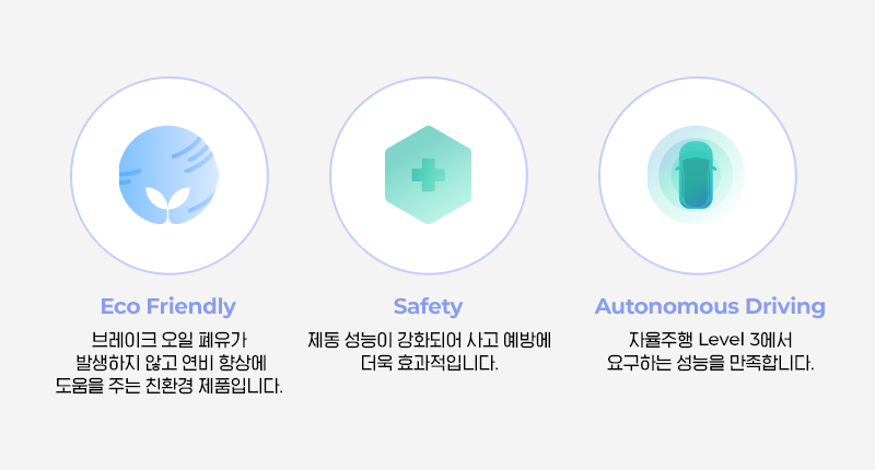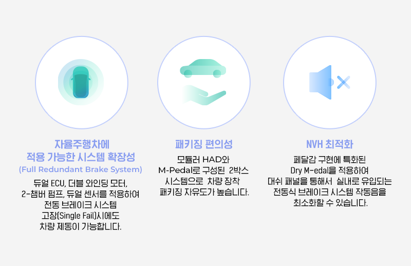 운전자의 브레이크 페달 작동량을 전기적 신호로 전달해 모터를 구동하고, 압력을 생성 및 제어하는 전동식 브레이크로 자율 주행을 위한 이중화 안전 기능이 (Dual Safety) 적용되어 있습니다. 이를 통해서 운전자의 개입없이 제동이 필요한 상황에서 모터를 제어해 차량을 제동시킬 수 있고, 전동식 브레이크 시스템에 고장(Single Fail)이 발생해도 차량을 제동할 수 있습니다.