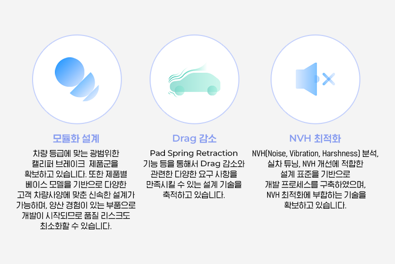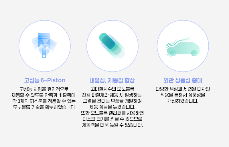 심플한 설계 구조로 동일 휠 사이즈에 대해 보다 큰 사이즈의 디스크 적용이 가능하므로 향상된 제동 성능 구현이 가능하고, 공기 역학을 고려한 감각적인 디자인 적용으로 상품성을 더욱 향상시킨 제품입니다.