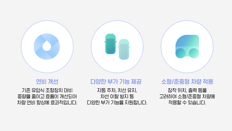 유압식 조향 장치와 달리 모터를 사용한 조향 장치 입니다. 가벼워진 제품 중량 및 효율 개선으로 차량의 연비 절감에 도움이 되고 차량 속도에 따라 적절한 조향력을 제공하여 고속에서도 안정적인 핸들링이 가능합니다. 자동 주차 및 자율 주행에 기본적으로 필요하며,