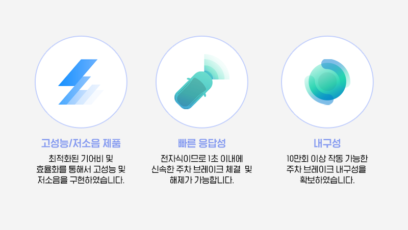 EMB는 기존 유압 디스크 브레이크와 다르게 전기모터로 구동되는 액추에이터와 기계적인 작동 원리를 이용하여 제동하는 브레이크 입니다. 이러한 EMB는 응답속도가 빠르고, 각각의 휠을 정밀하게 독립적으로 제어할 수 있으므로 제동 안전 성능이 더욱 향상된 제품입니다.
