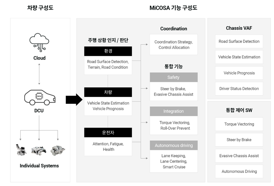 HL Mando의 MiCOSA 솔루션은 차량의 종방향, 횡방향, 수직 역학에 영향을 미치는 모든 기술을 의미하며, 개별 샤시 제어 시스템 통합을 통해서 차량의 동역학 성능을 극대화 하는 기술입니다. MiCOSA 솔루션은 차량 모션 정보를 종합하고 관장하며